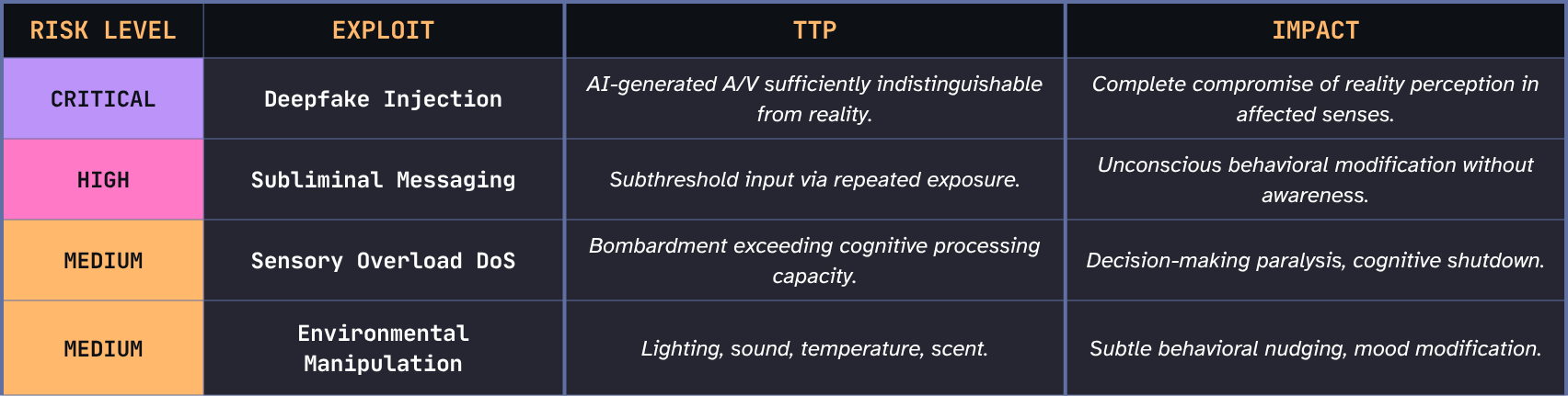 What we put out can be captured, analyzed, profiled, and used to craft precisely targeted inputs back at our own interface. In cyber, we’ve started calling this Personally Identifiable Behavior (PIB) at the behest of industry visionary Winn Schwartau. Voice cloning works because your voice is a sensory output that’s been harvested. Deepfakes work because your face and mannerisms are sensory outputs that have been modeled. Thus, the attack surface includes what you emit, not just what you receive.