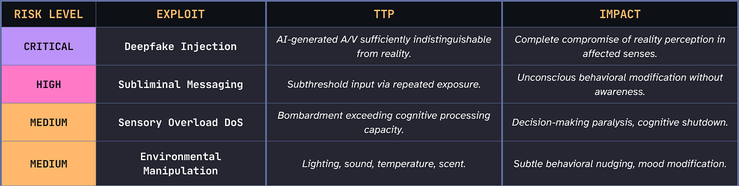 This layer is exploitable because it carries an implicit trust assumption we rarely examine. We trust our senses by default... we have to! There’s no practical alternative. You cannot verify every sensory input in real time before allowing it to proceed into processing. At present, our cognitive architecture isn’t built for a world where realistic synthetic stimuli are cheap and sufficiently indistinguishable from organic ones.