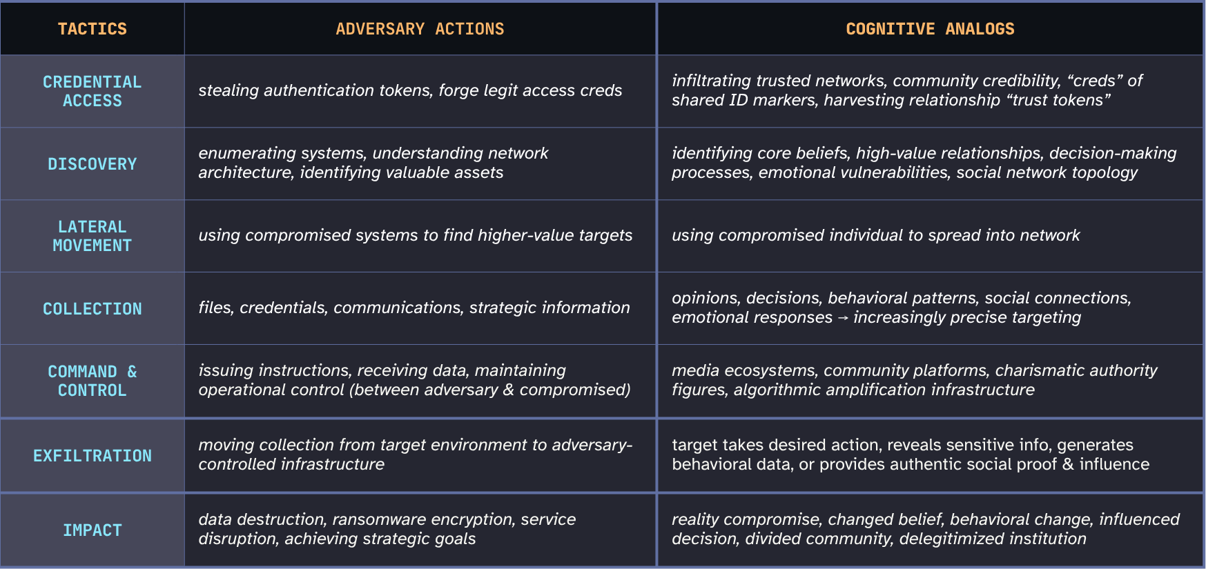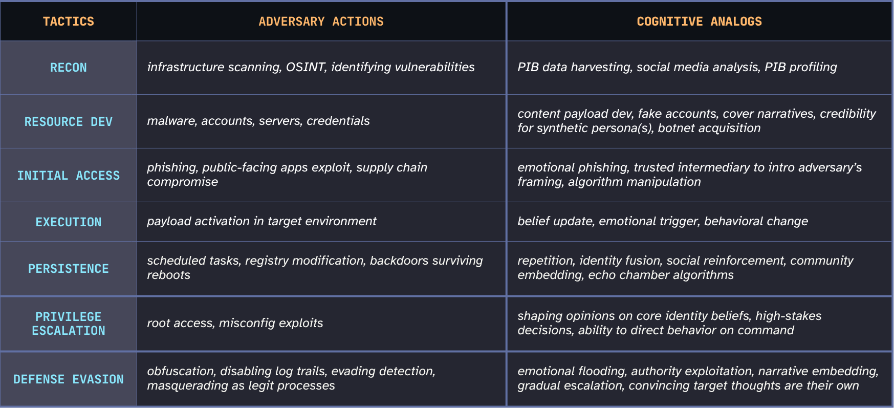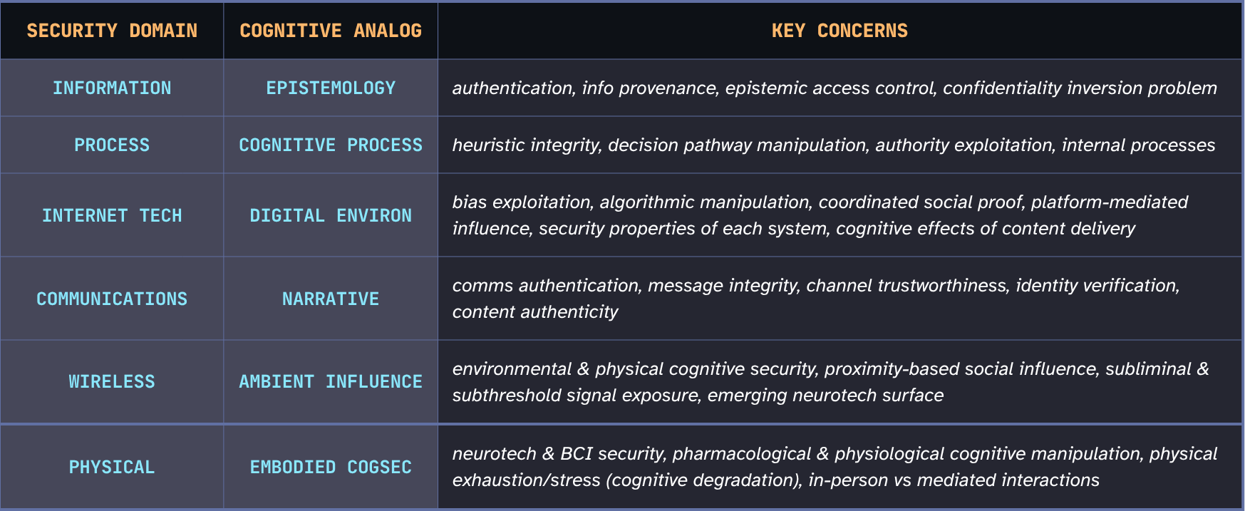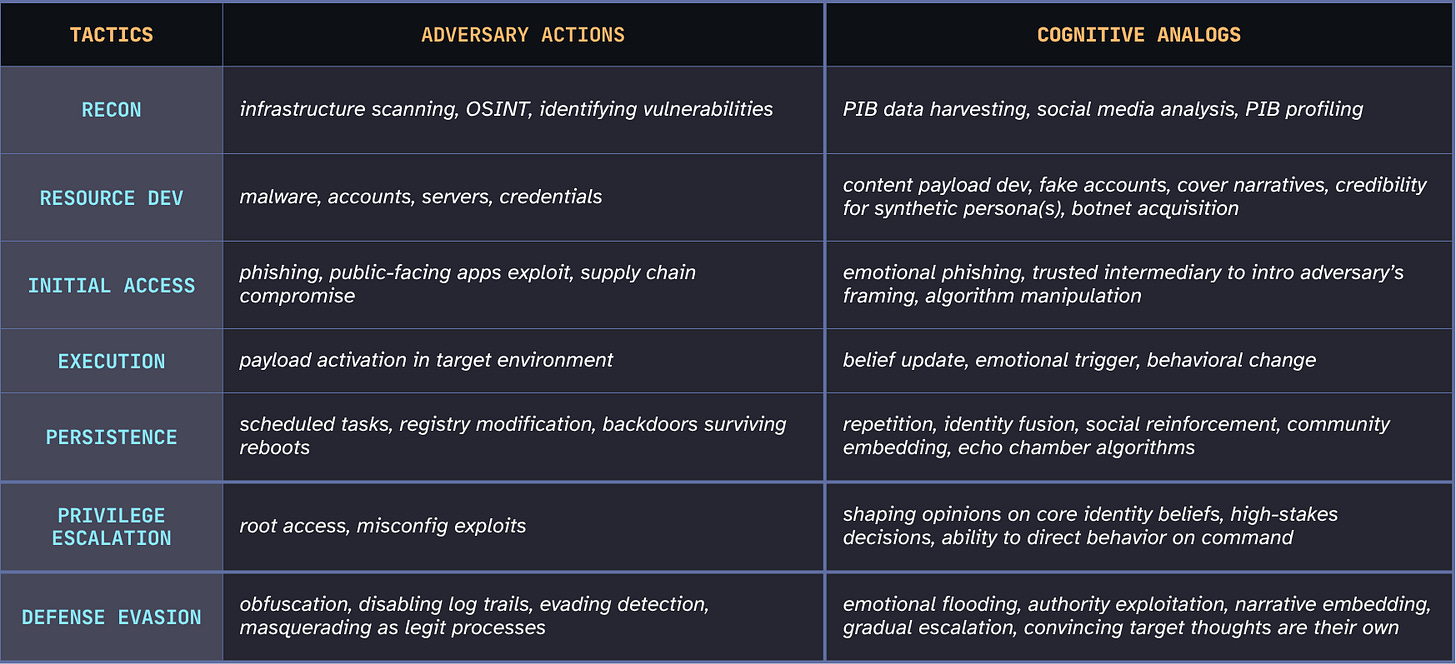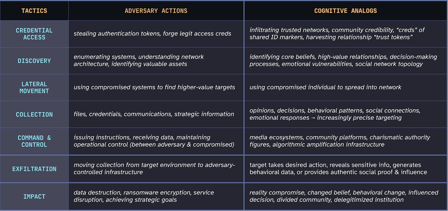 If a person holds a harmful false belief, was it organically formed? The result of a targeted operation? Cumulative ambient narrative manipulation? How would you know? How would they know? The forensics simply don’t exist. Incident response as currently practiced has no cognitive equivalent.