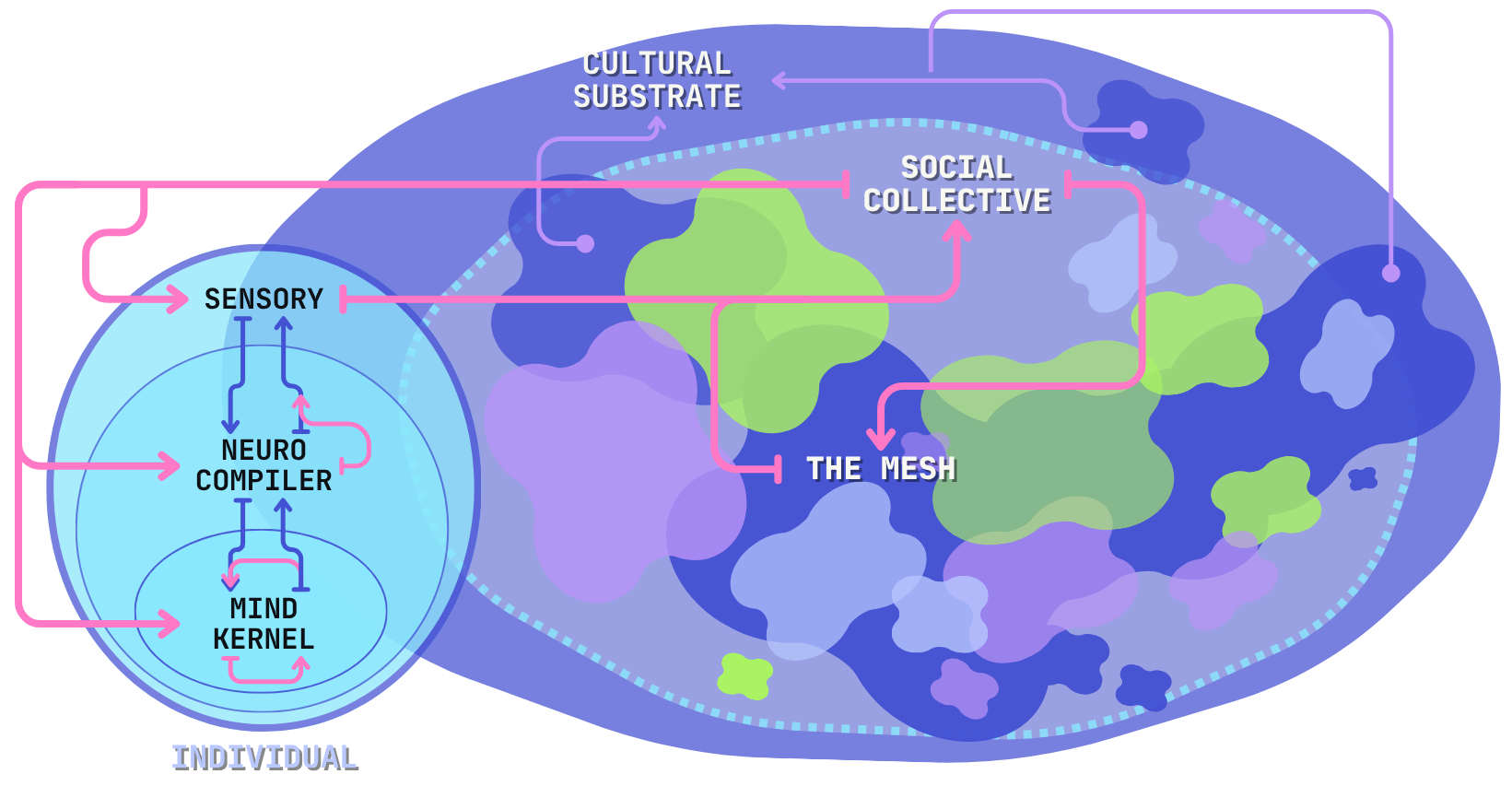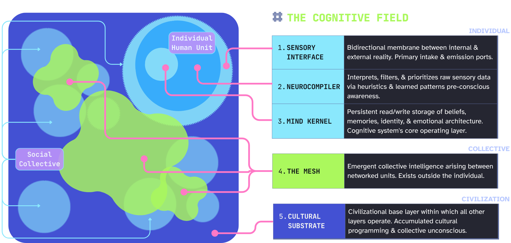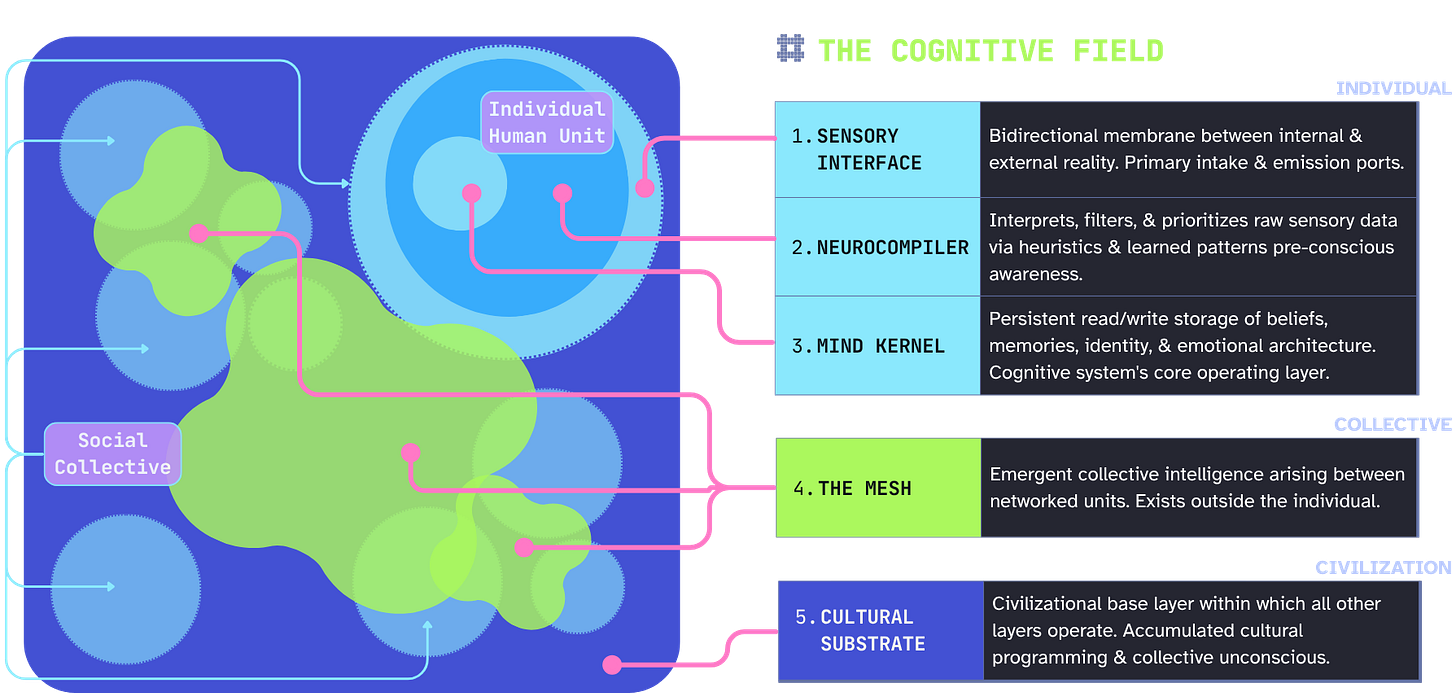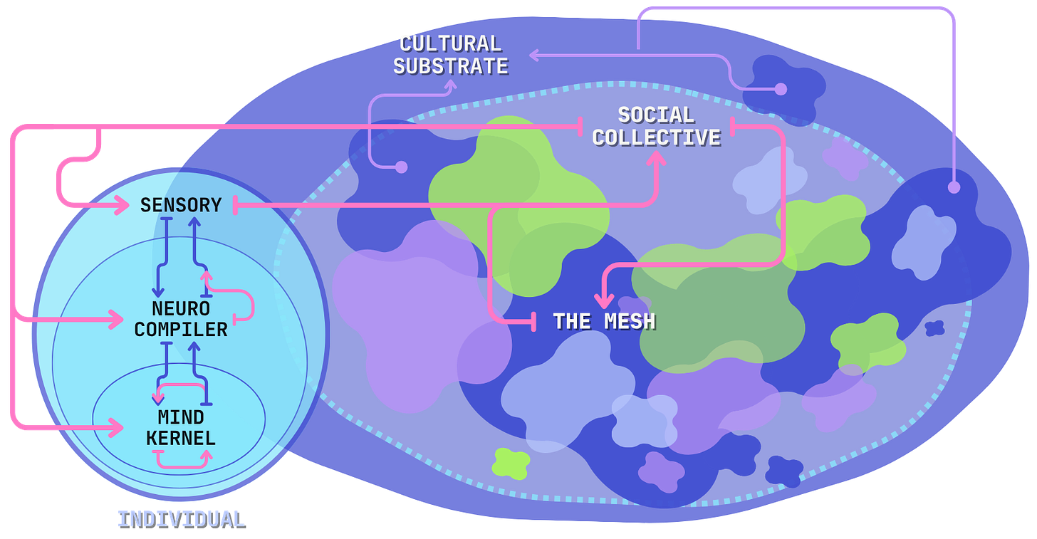 Beyond the individual, we cross into the collective, or what I’m calling the Mesh. This is the emergent collective intelligence arising between networked individuals. The final layer is called the Cultural Substrate, and is the civilizational base layer for macro-society and the collective unconscious.