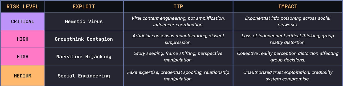 In practice, this might look like scoping a target’s cognitive profile, mapping their primary information inputs across the topology layers, simulating attack chains, scoring the vulnerabilities found, and reporting with guidance for remediation. This follows the same basic engagement structure you’d recognize from any penetration test (reconnaissance, exploitation, reporting, etc.) but targeting cognition rather than tech.