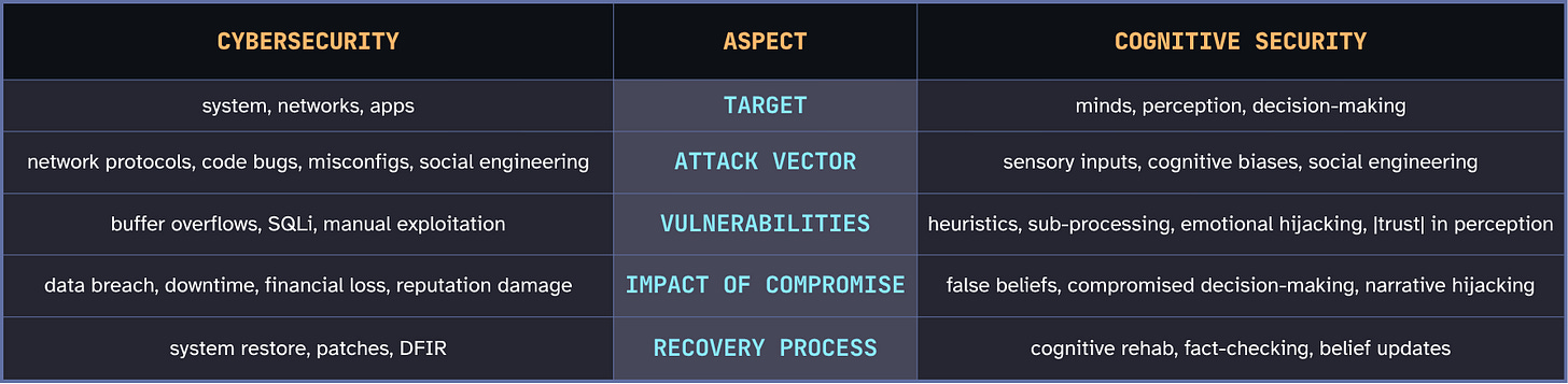 A phishing email is social engineering. The trust architecture that makes you believe authority figures without verification is the cognitive attack vector that the phishing email exploits. Defending against social engineering means training people to spot lies. Defending against cognitive attacks means understanding and hardening the processing architecture that makes lies effective in the first place.