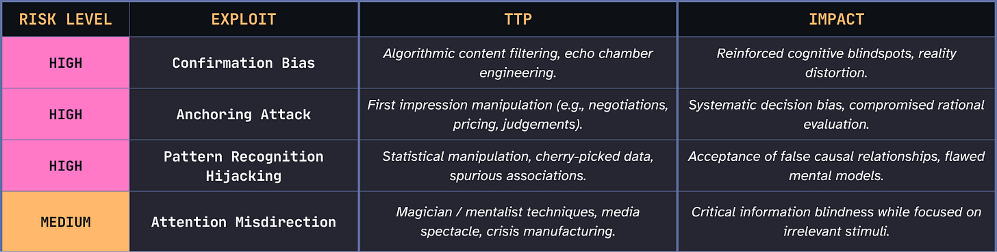 The speed is both an evolutionary feature and a modern bug. Processing here is fast enough to get you out of the way of a thrown object before you’ve consciously registered it. But “good enough most of the time” means “predictably wrong some of the time.” These systematic errors are fully documented, consistent across populations, and exploitable by anyone who studies them. The cognitive bias is, from an adversarial perspective, a targeting manual.