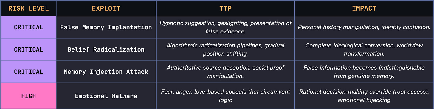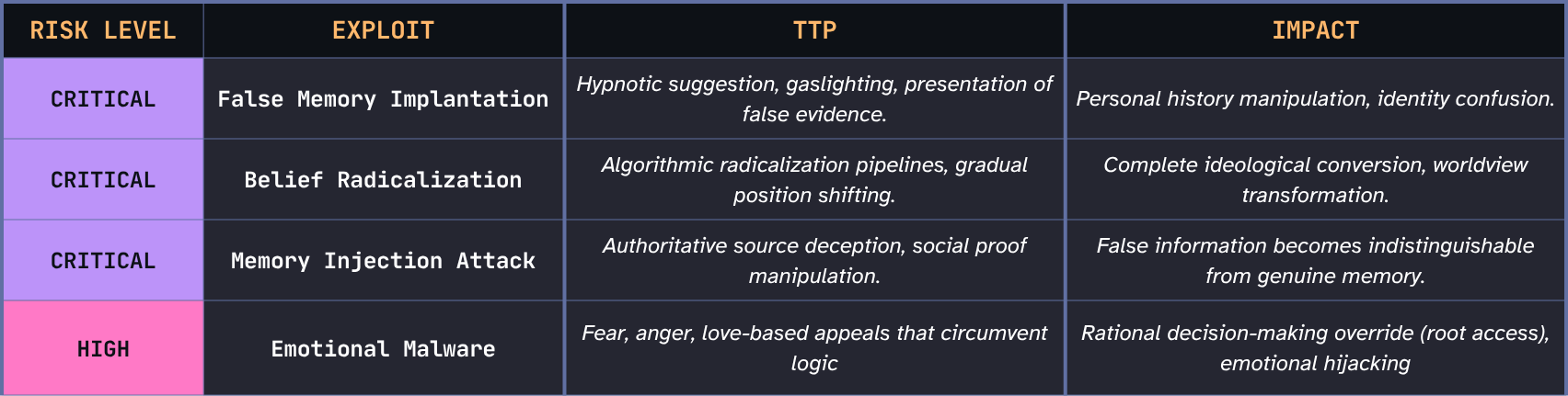 In an operating system, kernel-level access means you can modify the rules by which all programs run. Mind Kernel compromise works the same way by changing the belief-formation process itself, not just individual beliefs.