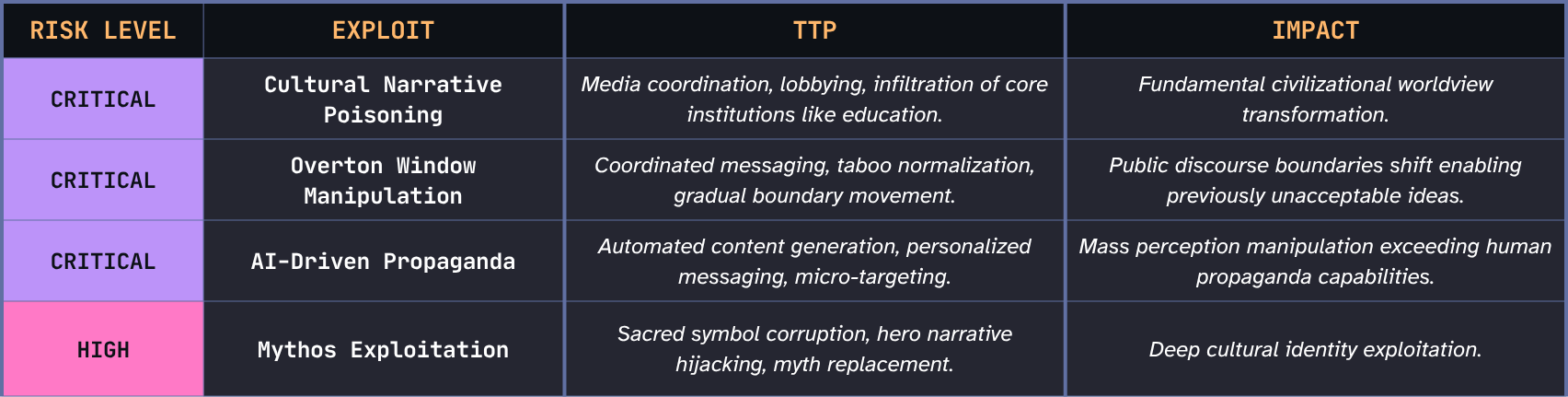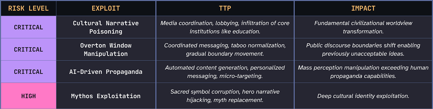 Cultural narratives are the ground on which individual identity, collective coherence, and institutional legitimacy all rest. Attacking them degrades the shared framework within which all information can be evaluated at all.Remediation operates on generational timescales.